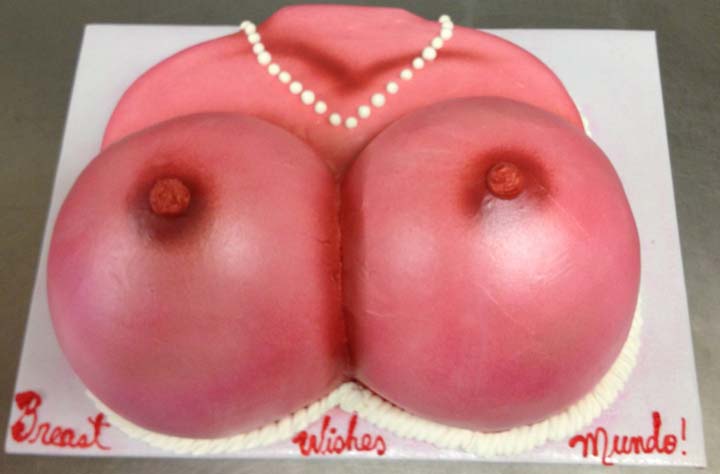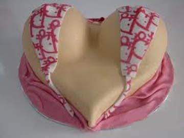 huge hooters breasts on pink satin and white sting bikini cake